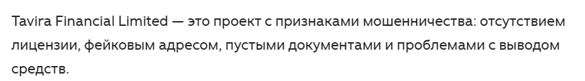 - Полное отсутствие подтвержденных отзывов об успешной работе с TaviraFx com и выводе средств говорит о высоких финансовых рисках при сотрудничестве.