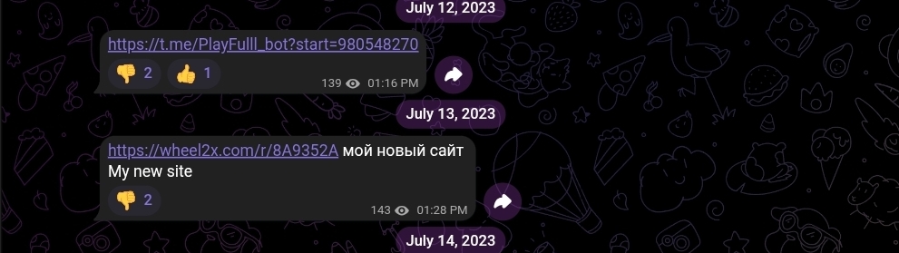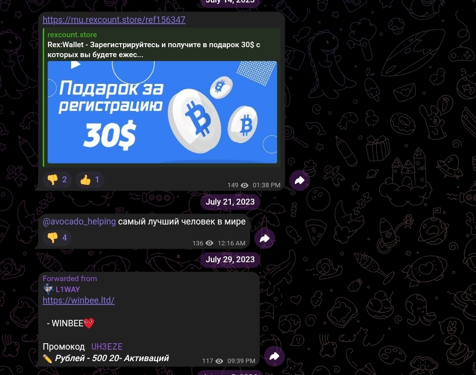 В июле 2023 года была дана ссылка на PlayFulll bot — Telegram — бот с непрозрачной механикой. Тогда же появилась ссылка на wheel2x com — рулеточный сайт. В середине июля, платформа, обещающая 30 долларов в подарок при регистрации и «ежесуточную прибыль» с них. В конце июля проект с промокодом. В августе 2023 года появились ссылки на nudes_razdevator_bot — бот, предлагавший генерацию компрометирующих изображений.