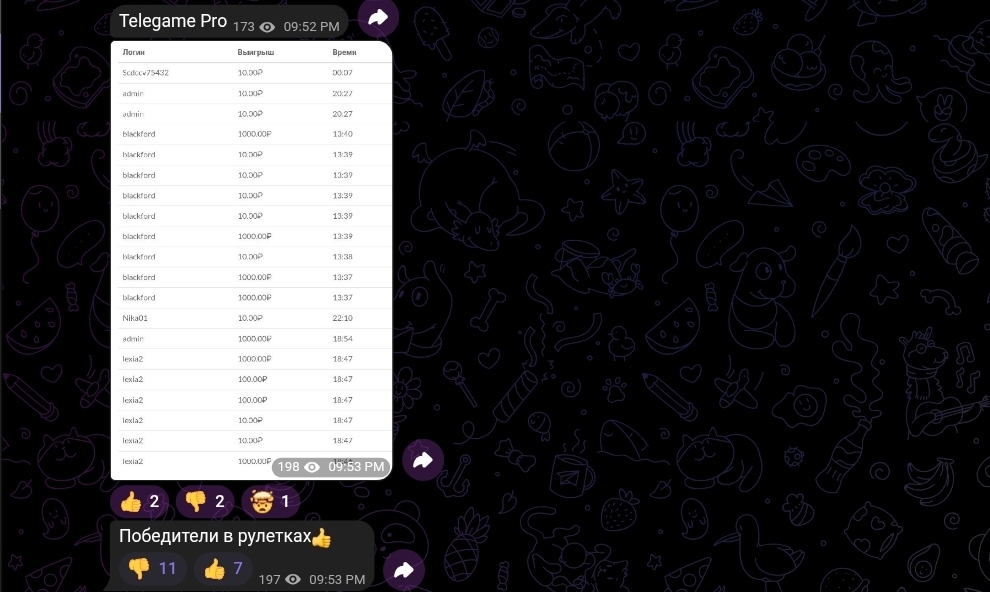 По описанию проект позиционировался как экономическая игра с элементами рулетки и якобы выплатами. Механика проста: участники делали небольшие ставки (от 10 до 1000 рублей), а в канале публиковались таблицы с никами и суммами, что-то вроде журнала транзакций внутри платформы. Никаких подробных правил, публичного устава или описания алгоритма начисления выигрышей в открытом доступе не было.