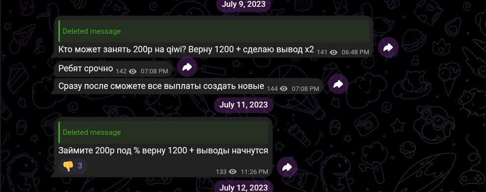 Пожалуй, наиболее показательный эпизод в истории Telegame — посты с просьбами занять деньги. Это характерная модель поведения, хорошо известная тем, кто отслеживает мошеннические схемы в Telegram. Оператор проекта, не имея реального источника дохода или пула средств для выплат, начинает занимать деньги у подписчиков под обещание многократного возврата. Подписчик переводит 200 рублей, выплаты не приходят, администратор исчезает. Ключевой маркер — конкретные суммы с гарантией возврата в несколько раз выше вложенной: такое условие невыполнимо ни в одной легальной схеме.