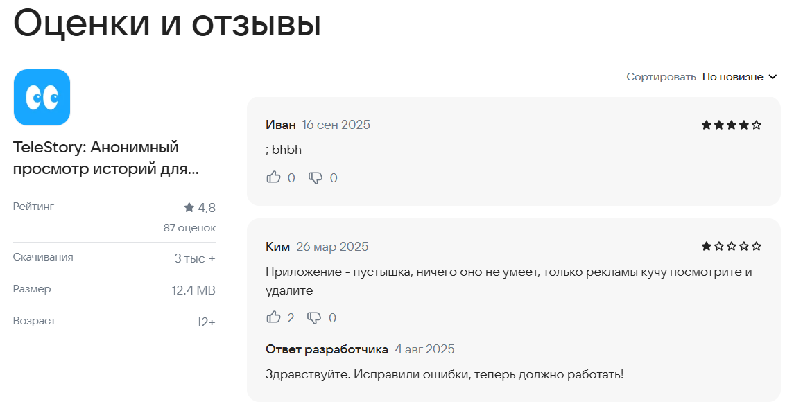 Отзывов о сервисе Tele Story Bot на независимых платформах относительного немного. Один из пользователей назвал приложение пустышкой, которая ничего не умеет делать, кроме показа огромного количества рекламы. После этого он сразу порекомендовал удалить его.
