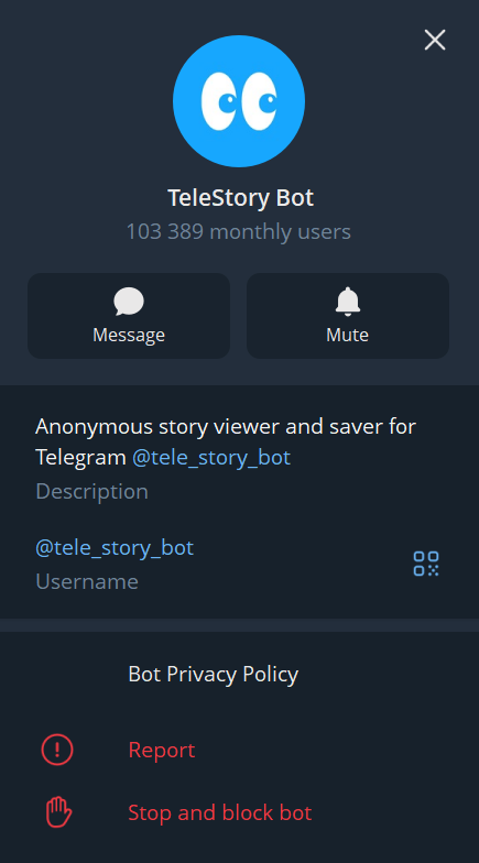 «Телестори Агент» предоставляет услуги по просмотру и сохранению историй пользователей Телеграма. Бот позволяет отправить ему никнейм, ссылку на профиль или номер телефона. После этого он загружает активные на текущий момент истории человека и отображает их в чате в виде медиа-файлов. Их можно просматривать, скачивать на устройство и пересылать дальше.