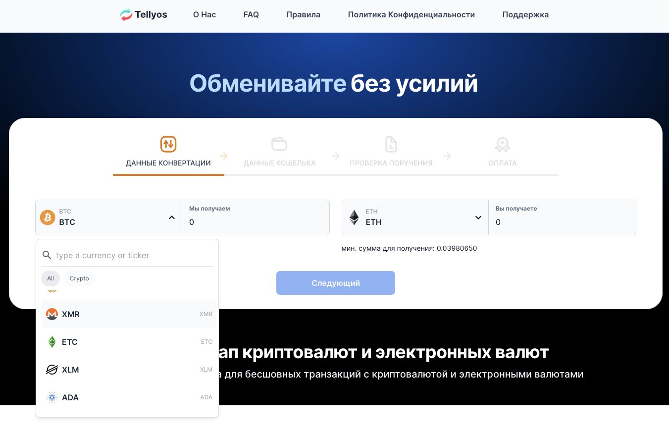 Tellyos com — это криптовалютный обменник, на сайте которого заявлена поддержка около двадцати видов цифровых активов. Среди них присутствуют наиболее популярные токены: btc, eth, ada, xmr и др.