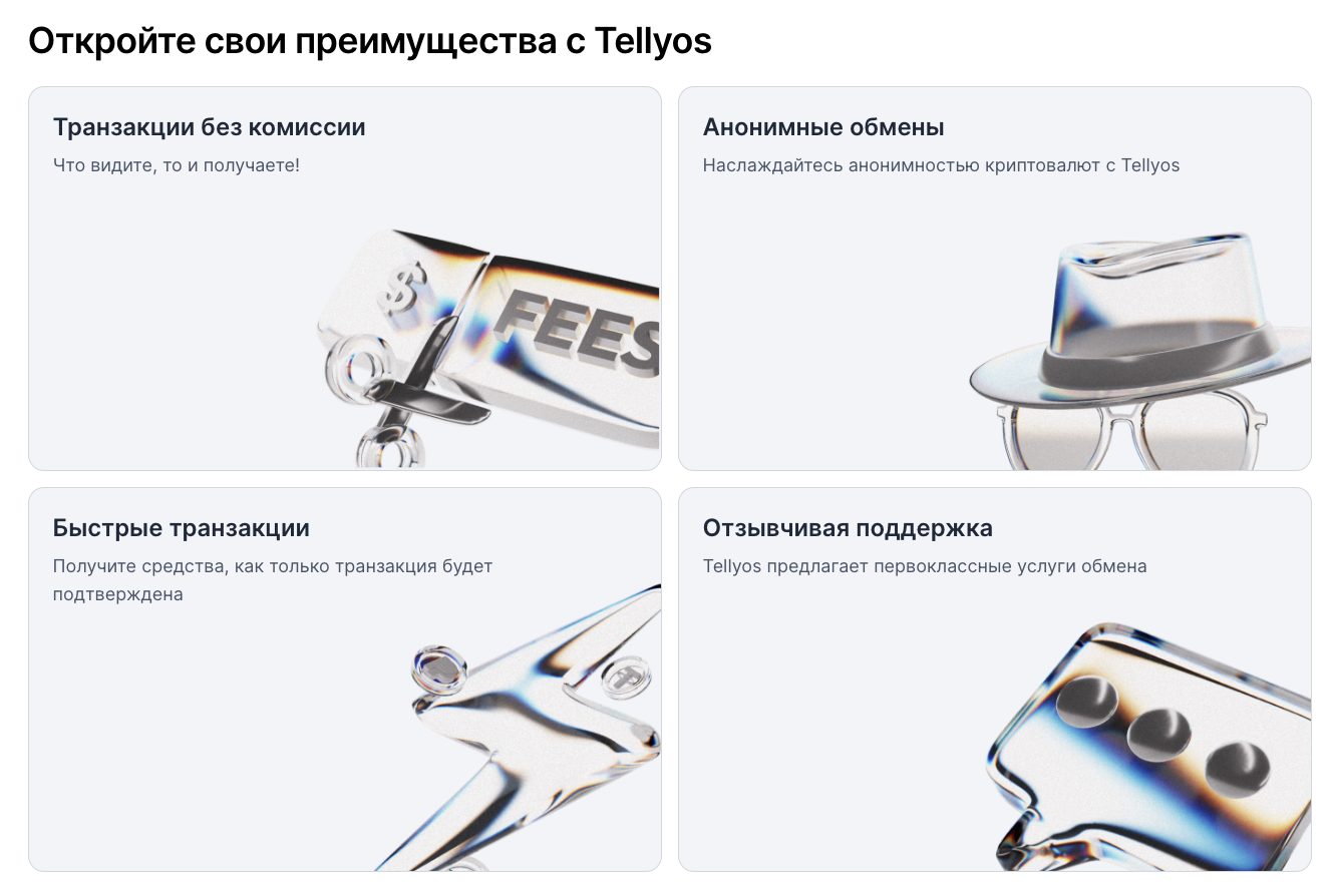 Tellyos — обменник, поддерживающий операции только с криптовалютами. Его владельцы обещают высокую скорость исполнения заявок.