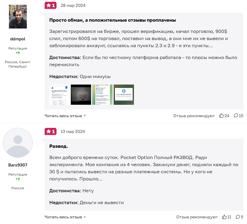 Вокруг брокера Pocket Option, ходит огромное количество слухов и жалоб. Проблема в том, что платформа не обладает надежными лицензиями/регуляцией, из-за чего они блокируют аккаунты без объяснения причины. Вдобавок они известны своей партнерской программой, где за слив депозита реферала вам выплачивают процент от этой суммы. Это подтверждает и постоянная блокировка доменов площадки Pocket Option, можно заметить огромное количество зеркал.