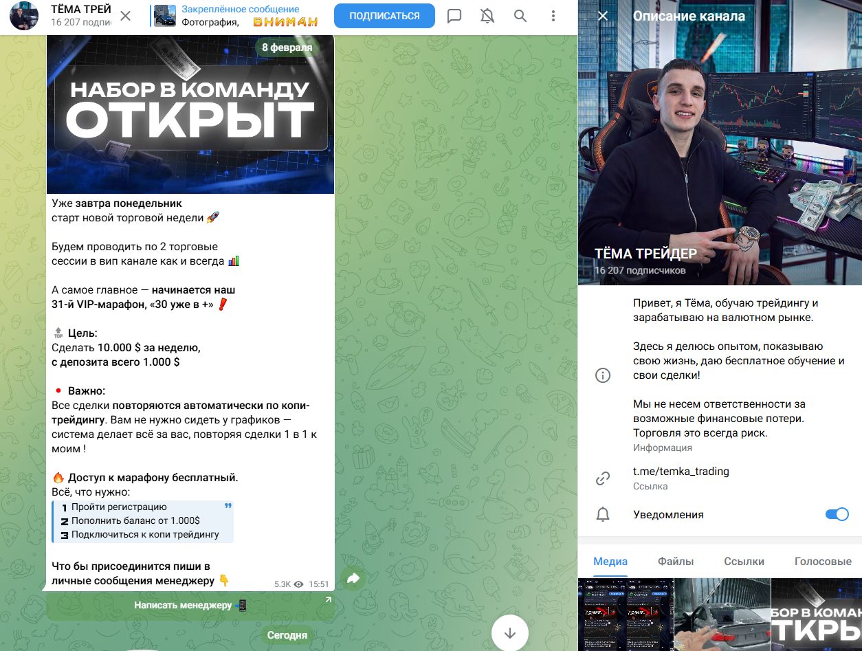 Тема Трейдер — это телеграм канал, где автор привлекает рефералов на биржу Pocket Option для торговли по системе копитрейдинга. Артем заявляет, что создал ИИ бота, который выдает сигналы с проходимостью до 98%, а чтобы подтвердить навыки он проводит прямые эфиры по трейдингу и выкладывает отзывы в своем сообществе. Однако среди инфлюенсеров Pocket Option много инфоцыган, которые зарабатывают исключительно на партнерской программе. Стоит ли доверять Temka Trading, узнаете в данной статье.