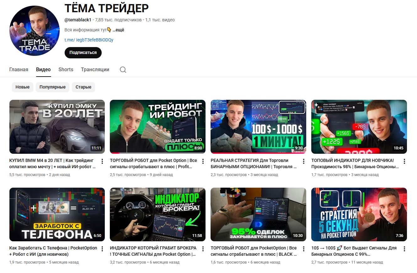 Если поискать похожих инфлюенсеров на YouTube, то можно спокойно найти сотни, если не тысячи идентичных аккаунтов, где схема примерно одинаковая. Люди под видом торгового ИИ бота, качественной аналитики или других предлогов призывают вступить в тгк. Там подписчики узнают о наличии VIP группы, для получения доступа к которой необходимо зарегистрировать аккаунт на Pocket Option по его реферальной ссылке.