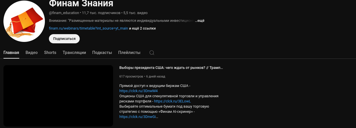 На ютубе контент аналогичный — репост с телеграма. Упоминание платных услуг мы не встретили. Возможно, пока владелец проекта «Темная сторона Московской биржи» «Хомяк Разумный» Андрей Саморядов набирает аудиторию, чтобы потом предложить курсы или индивидуальные консультации.