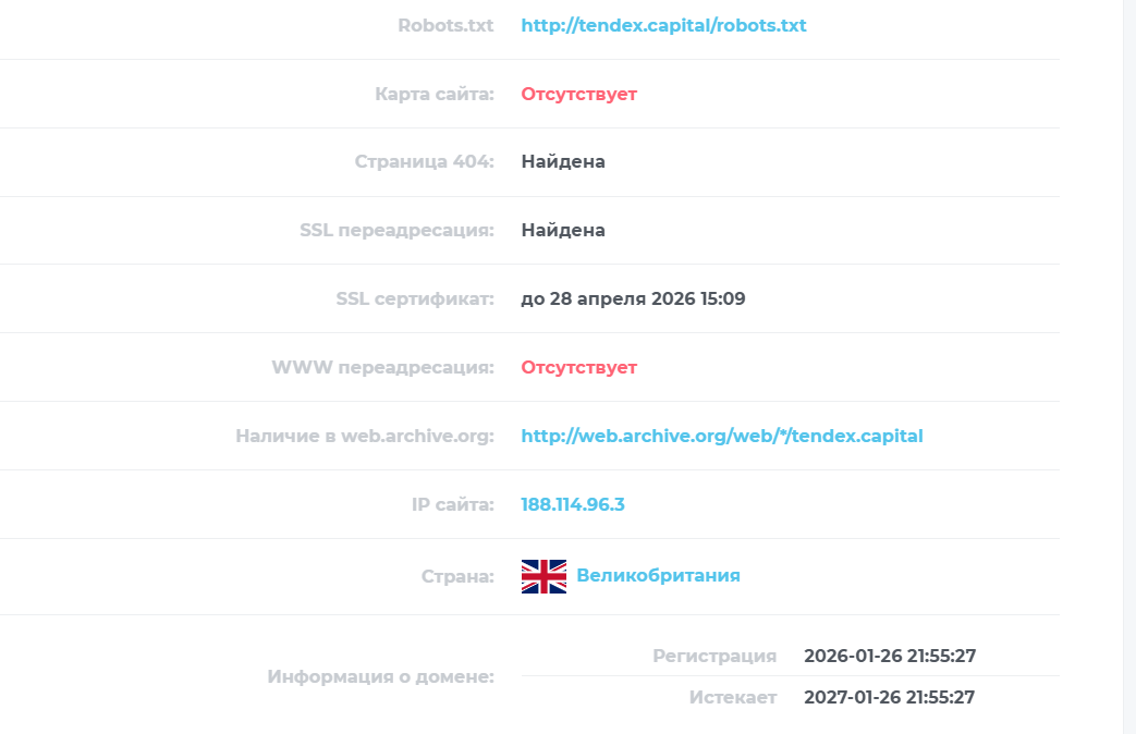 Очередным заявлением, которое косвенно или напрямую опровергается – информация о дате основания. Домен Tendex capital был зарегистрирован лишь 26 января 2026 года, то есть на момент выхода обзора платформа работает всего лишь полтора месяца. Это сильно расходится с заявленным семилетним сроком работы.