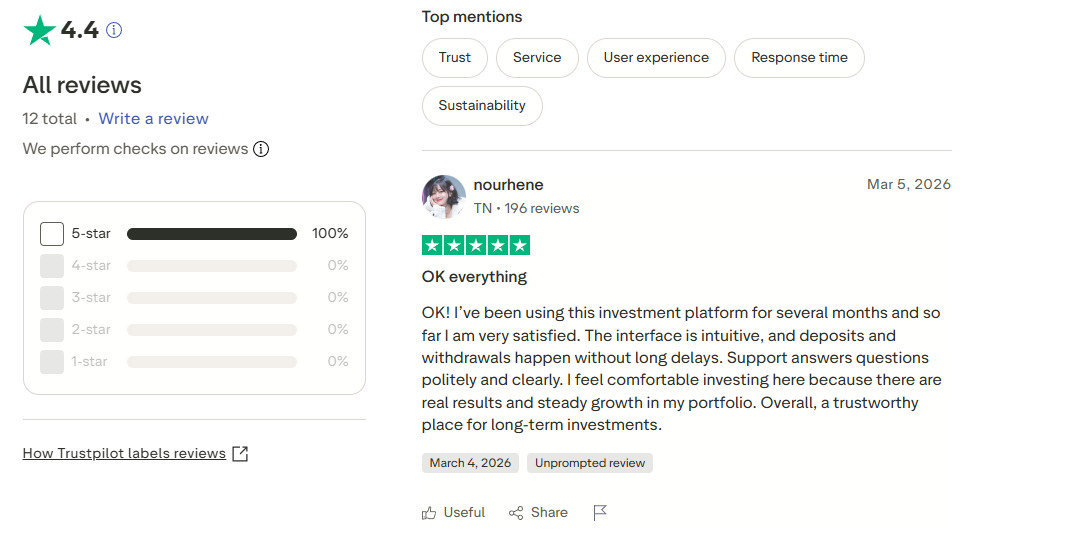На TrustPilot есть профиль Tendex capital, где можно ознакомиться с отзывами. Средний рейтинг – 4.4 на основе 12 оценок. Мнения в основном положительные, однако стоит обратить внимание на пользователей.