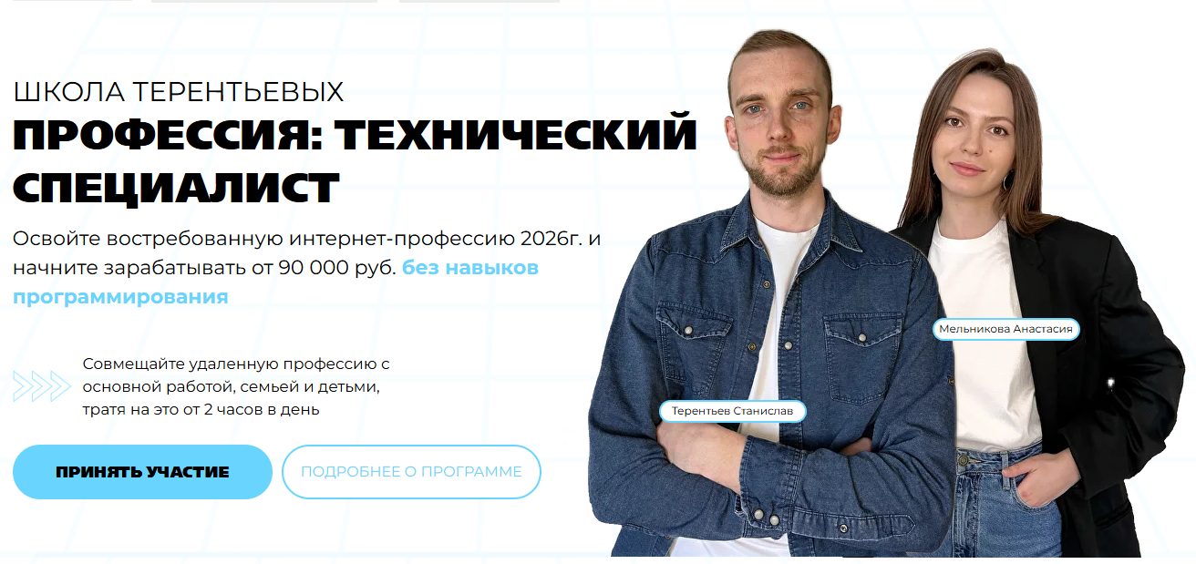 В «Школе Терентьевых» пользователям предлагают единственную программу — «Профессия. Технический специалист». Курс рассчитан на 6–8 недель, дополнительно клиенты получают еще месяц поддержки. Обучение ведут исключительно в онлайн-формате и состоит оно из 9 модулей.
