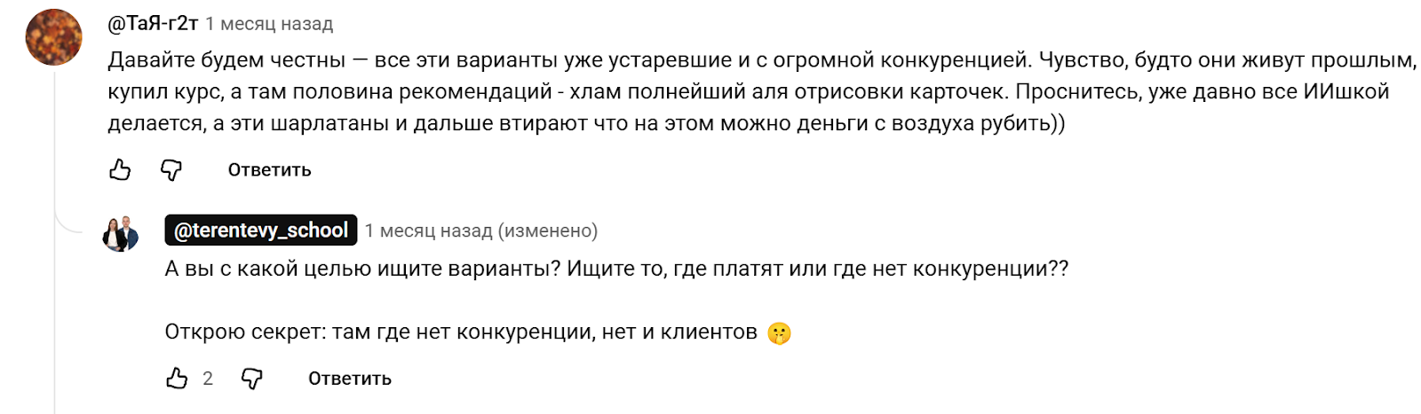 Единичные комментарии студентов удалось обнаружить только в комментариях под роликами на официальном канале «Настя Мельникова и Стас Терентьев | Фриланс с нуля». И позитива в них немного, большинство сообщений написаны в негативном стиле. Среди недостатков проекта Online Terentev School пользователи отмечают: