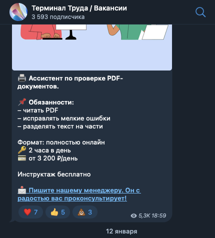 «Терминал Труда» — канал в Телеге, в ленту которого выкладывают информацию о высокооплачиваемых вакансиях, которые не требуют от соискателя специальных навыков.