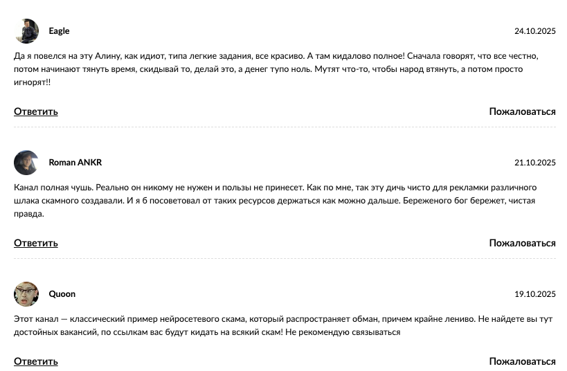 Весь обнаруженный нами фидбэк о проекте является негативным. Авторы отзывов утверждают, что после отклика на вакансию им начали предлагать участвовать в схемах лохотрона.