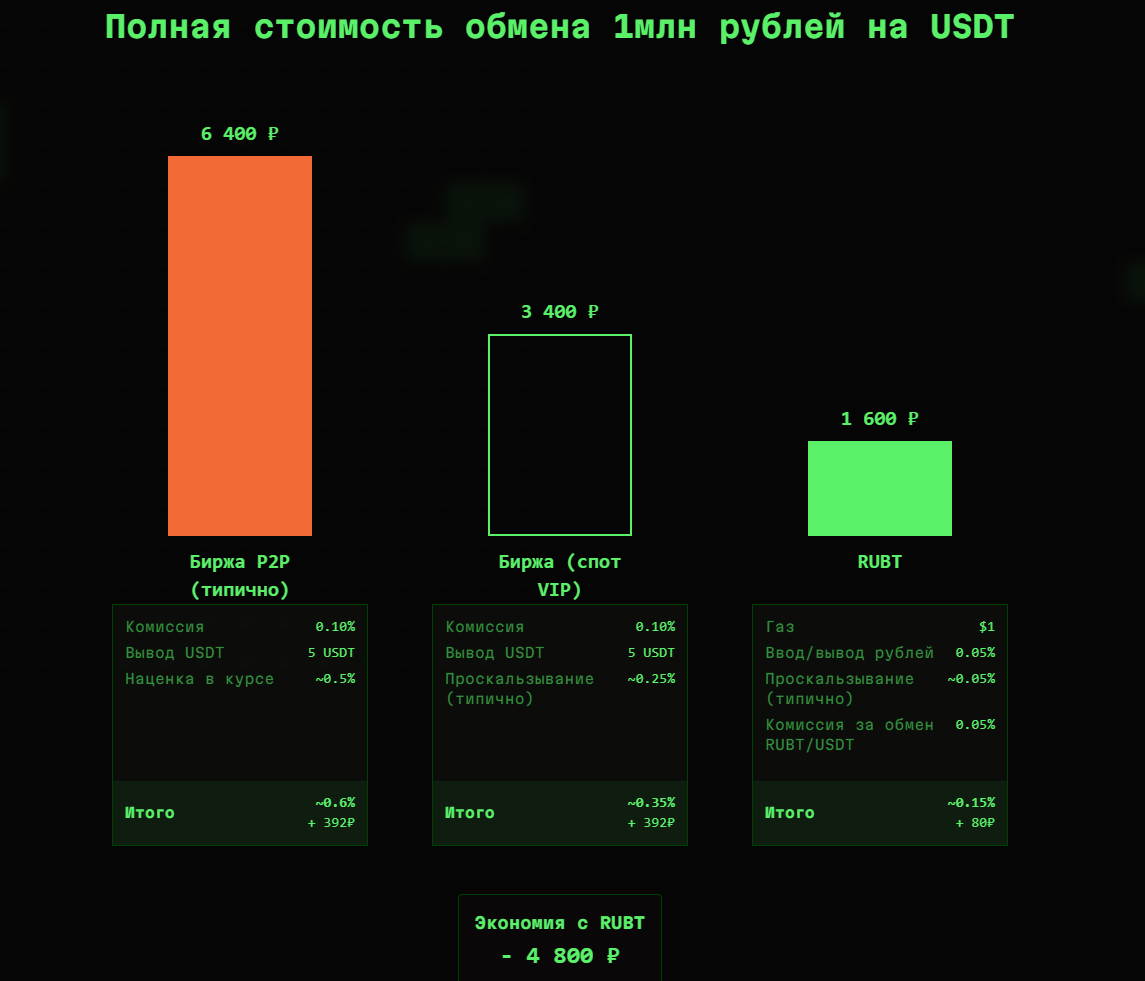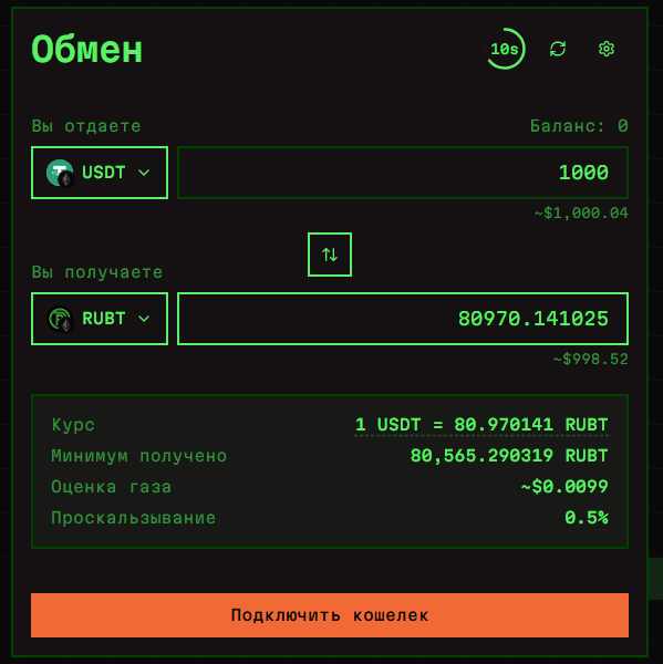 Внутри площадки обмен организован через промежуточный крипто-токен RUBT, который играет роль технического моста между фиатом и криптовалютой. Сначала пользователь вносит рубли, после чего система выпускает эквивалентное количество RUBT. Далее этот токен задействуют для обмена на криптовалюту USDT через пулы ликвидности на децентрализованной бирже Uniswap. Обратная операция работает аналогично.
