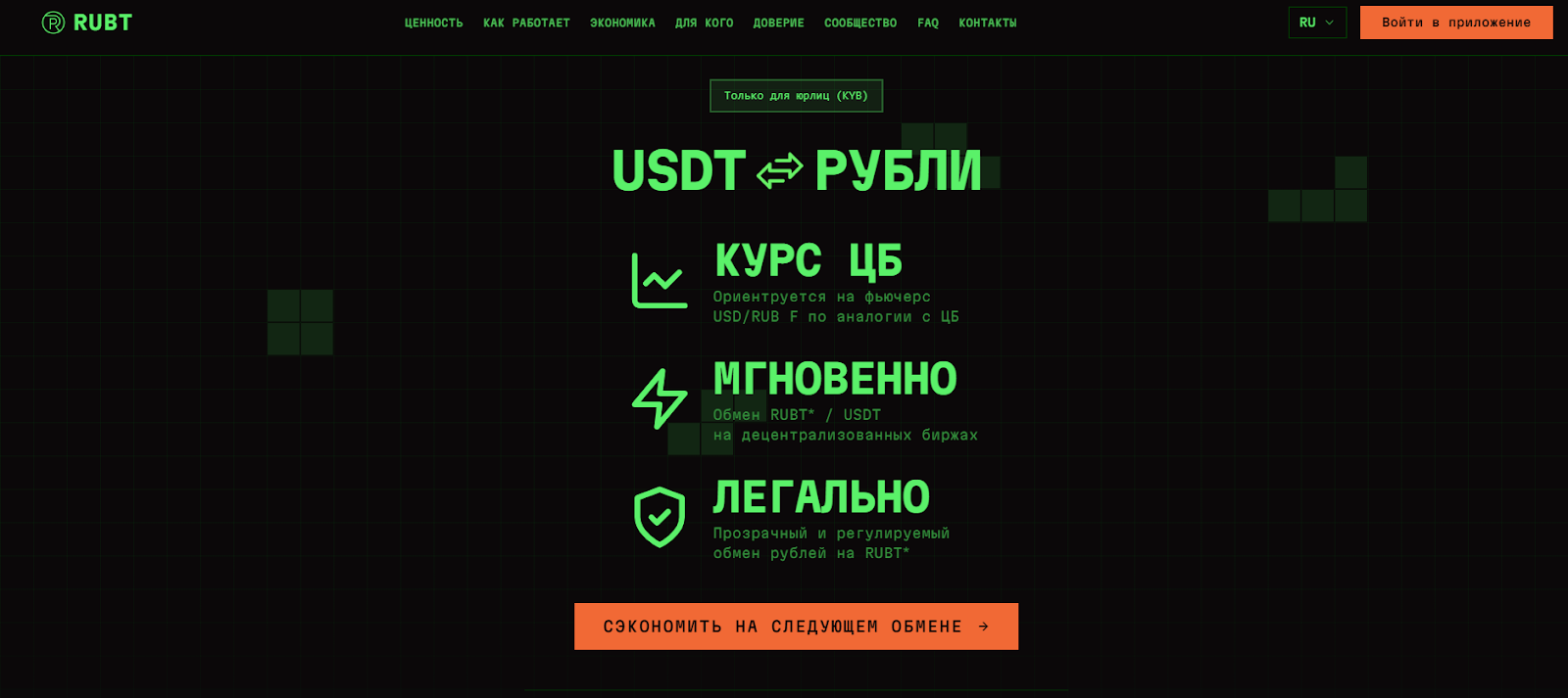 - Понятный механизм работы через криптотокен RUBT;