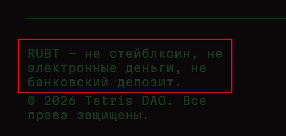 Также на сайте честно предупреждают о том, что криптовалюта RUBT не является стейблкоином, электронными деньгами и банковским депозитом. Однако данное предупреждение опубликовано с использованием мелкого шрифта, что делает его почти незаметным.