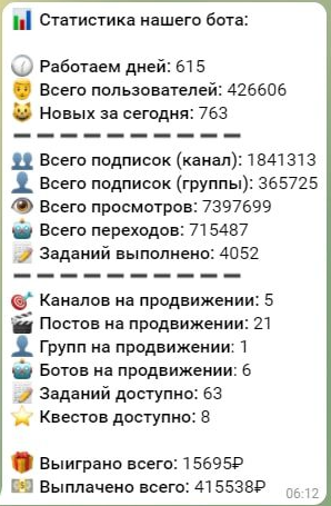 В первом же сообщении нам демонстрируют статистику, но опять же проверить ее в большинстве случаев не представляется возможным. Однако в то, что тг-бот функционирует уже практически 2 года, верится с большим трудом, т.к. его упоминания в сети начали появляться недавно.