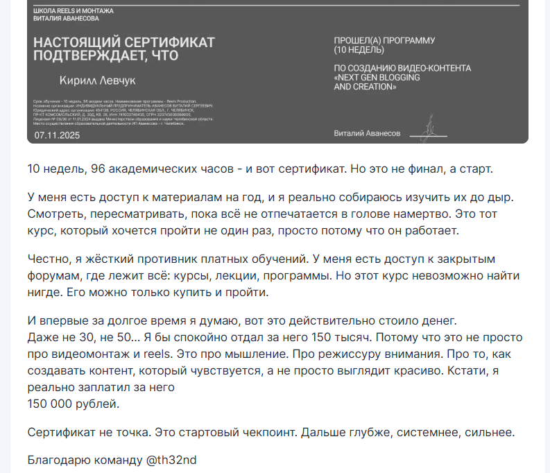Сейчас о Th32nd отзывы встречаются только положительные, но не частые. Стоит отметить, что публикуются излишне развернутые и подробные отзывы, которые достаточно похожи на заказные. Это касается как текстовых комментариев от учеников, так и видео, где люди с восторгом рассказывают об обучении и полученных материалах. Характерно для постановочных отзывов тут не сообщается стоимость курса, как и на официальном сайте. Это может быть частью технического задания. Поэтому доверять полностью таким комментариям не стоит, но и негативные отзывы курс Виталия Аванесова не получил.