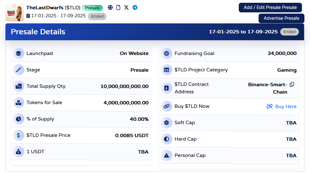 Зе Ласт Дварфс — это токен, созданный для одноименной Telegram-игры и экосистемы The Last Dwarfs. Разработчики представляли его как governance- и utility-токен, который должен был использоваться в игре, в системе стейкинга и в Gamified Launchpad — площадке для раннего доступа к новым криптопроектам. Формально проект присутствует на Coinsniper, однако ни капитализация, ни ликвидность, ни цена монеты не отражены.