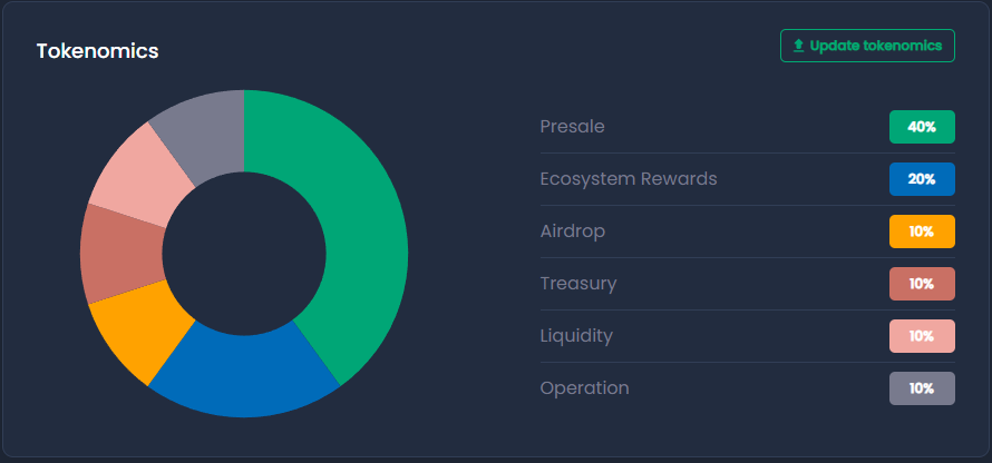 Изначально команда заявляла цель привлечь $34 млн инвестиций и продать 4 млрд токенов, что составляет 40% эмиссии. Однако параметры Soft/Hard Cap, объемы продаж, структура аллокаций и механики вестинга не раскрывались. Сейчас прогнозировать стоимость монеты невозможно, так как проект полностью потерял активность, а листинг не состоялся.