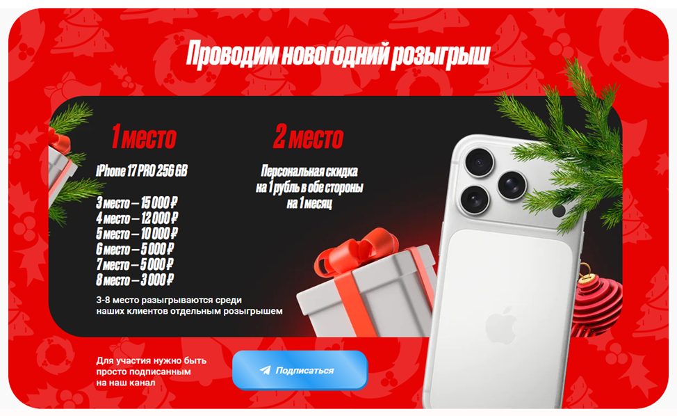 Для привлечения клиентов обменник Tex даже анонсировал новогодний розыгрыш призов: iPhone 17 PRO 256 GB, призовой фонд на 50 000 рублей и персональные скидки. Судя по постам в канале от 25 декабря, все победители получили свои подарки.