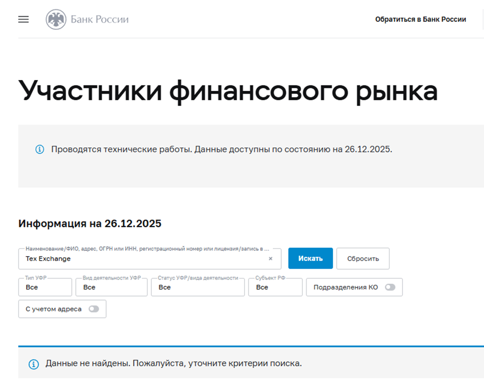Проверка данных на сайте регулятора ожидаемо не дали результатов по всем известным наименованиям. Tex Exchange обязан был получить лицензию оператора цифровых финансовых активов, но ее у него нет.