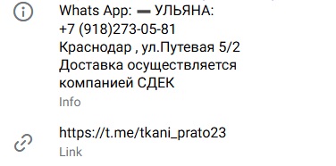 Жена попросила заказать ткань нашла этот магазин в телеге! Ну ладно 5000 подписчиков вроде норм! Ага как бы не так! Оформил заказ оплатил и всё! Ни трек номера ни ответа! Начал проверять адрес в Краснодаре а его не существует! Вы чё там совсем страх потеряли? Просто подарил кому то деньги! Это не магазин а полнейший разнос нервной системы!