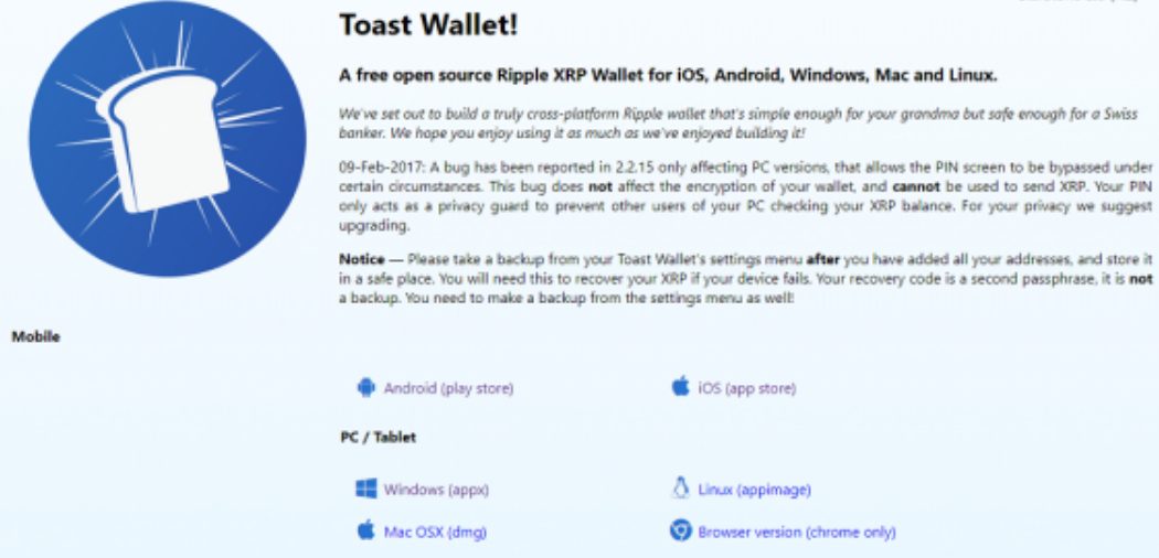 Криптовалютный кошелек Toast Wallet был представлен на сайте toastwallet com. Сейчас веб-ресурс не открывается. При попытке открыть его, мы попадаем на страницу проекта в Твиттере. Раньше этот сервис был широко известен. Многие владельцы XRP выбирали его в качестве локального хранилища. Он был разработан для разных операционных систем, включая MAC, Windows, Linux, Android или iOS.