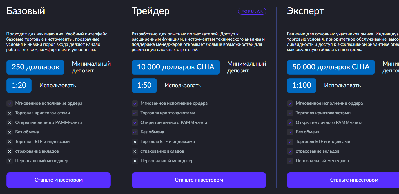 Кредитное плечо различается. «Базовый» дает 1:20, «Трейдер» – 1:50, «Эксперт» – 1:100. На дорогих счетах доступны торговля криптовалютой, ETF, индексами, страхование вкладов и персональный менеджер. Спреды узкие, комиссия прозрачная. Но конкретных цифр нет. Оценить реальные условия невозможно.