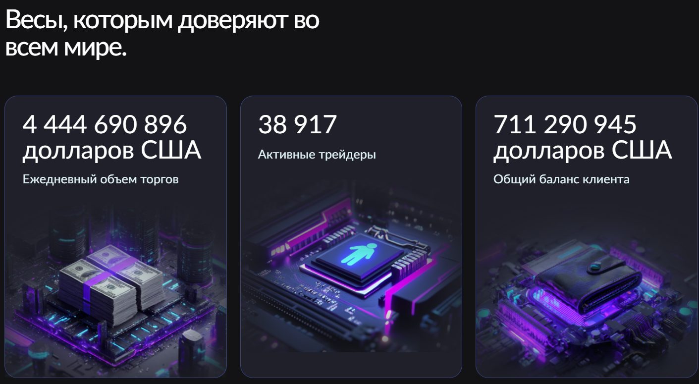 На главной странице красуются впечатляющие цифры. Ежедневный объем торгов якобы 4,4 млрд долларов. Активных трейдеров больше 38 тысяч. Общий баланс клиентов достигает 711 млн долларов. Верить этому нельзя.