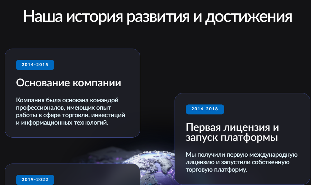 Раздел «О нас» описывает историю с 2014 года. Указаны этапы получения первой лицензии, географическое расширение и подключение к поставщикам ликвидности. На странице безопасности говорится о многоуровневой защите. Никакая информация не подтверждается.