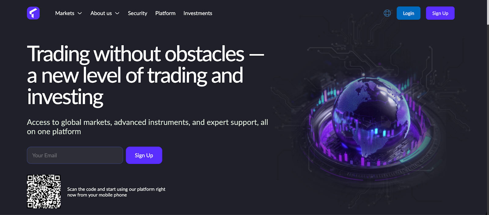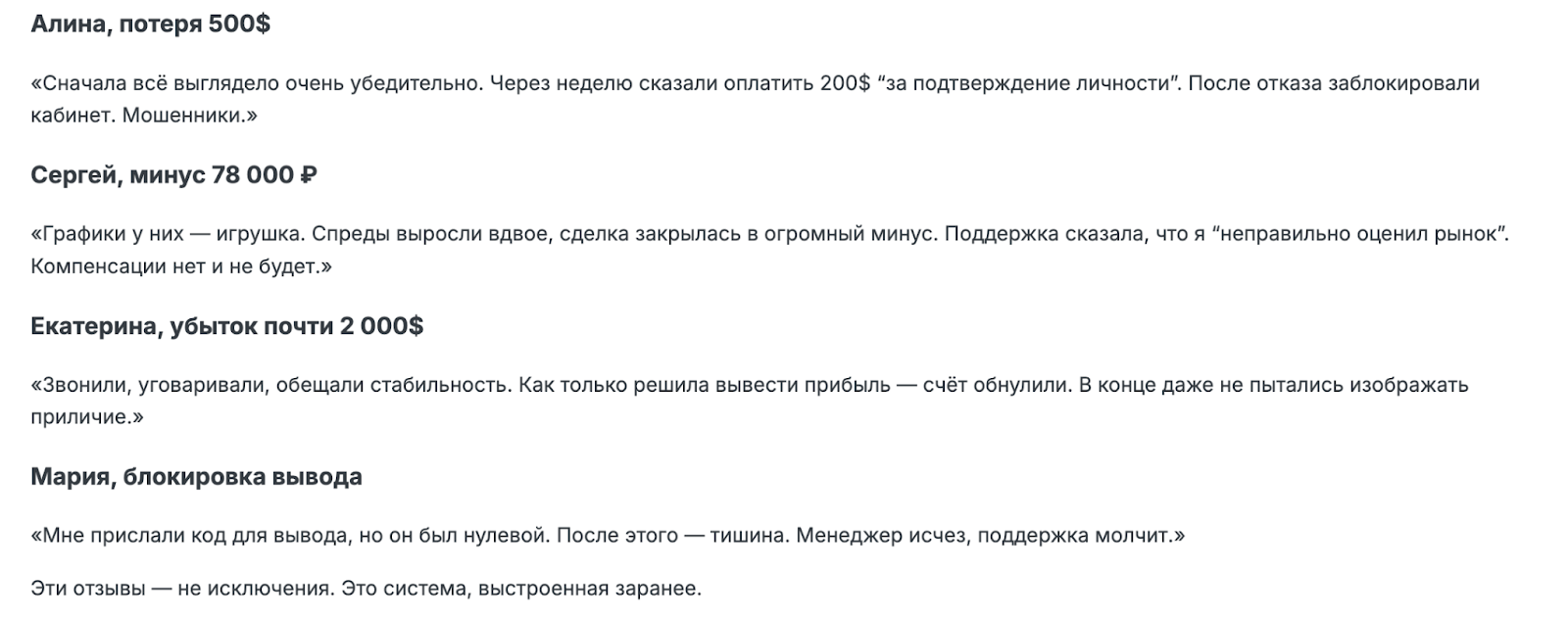 Визуально проект выглядит как типичный брокер нового поколения. Аккуратный сайт, уверенные формулировки про ликвидность, аналитику, поддержку 24/7 и помощь на каждом этапе торговли. Основной упор делается не на самостоятельную работу трейдера, а на взаимодействие с менеджером. Пользователю сразу дают понять, что без куратора раскрыть потенциал платформы сложно, а лучший результат возможен только при активном сопровождении.