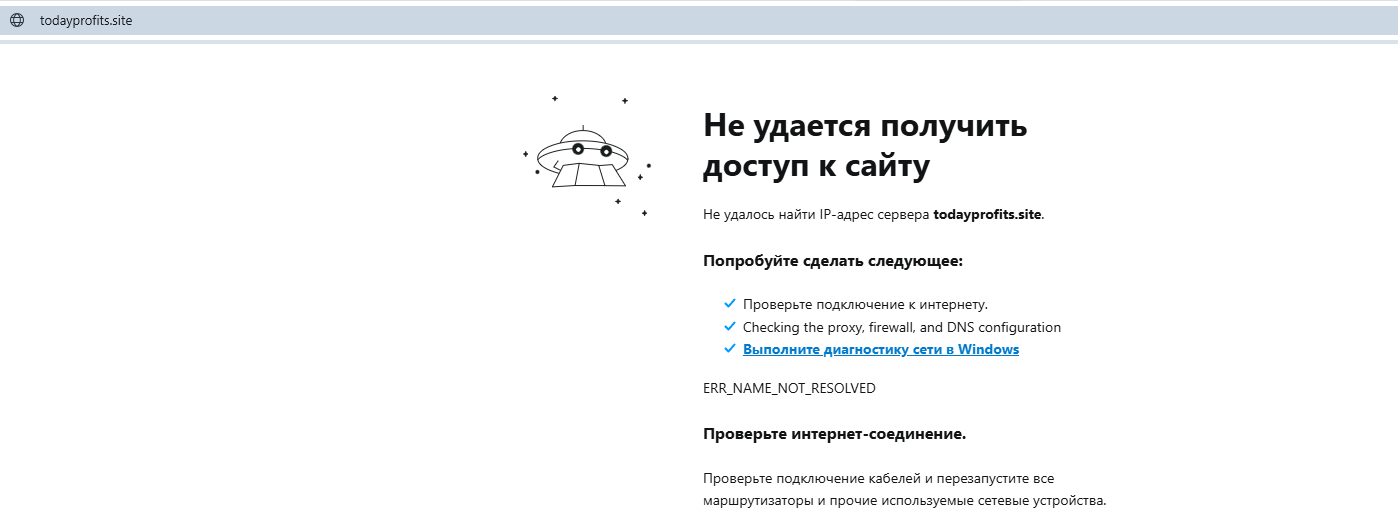 Сайт todayprofits site на момент проверки не открывается, что является критическим фактором для оценки надежности.