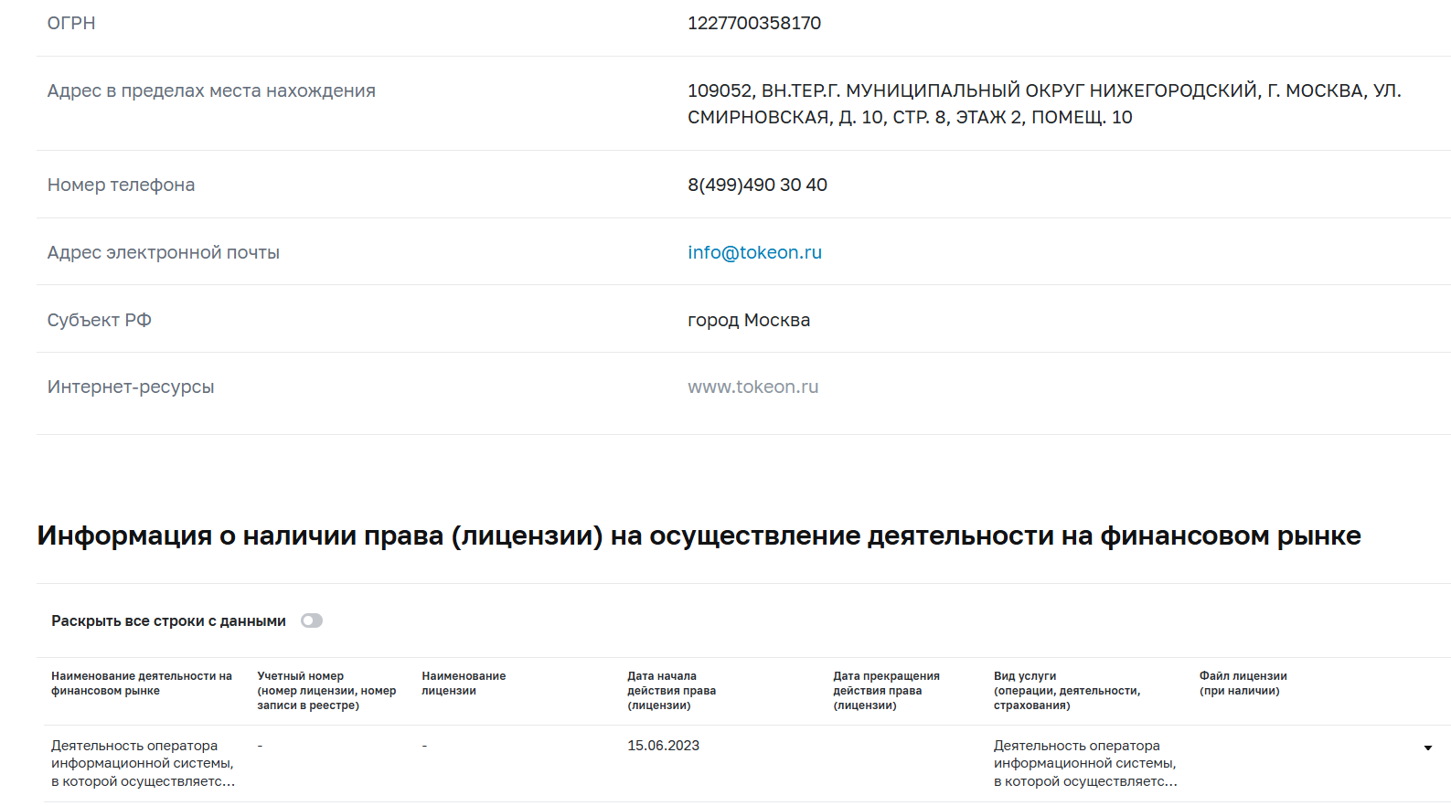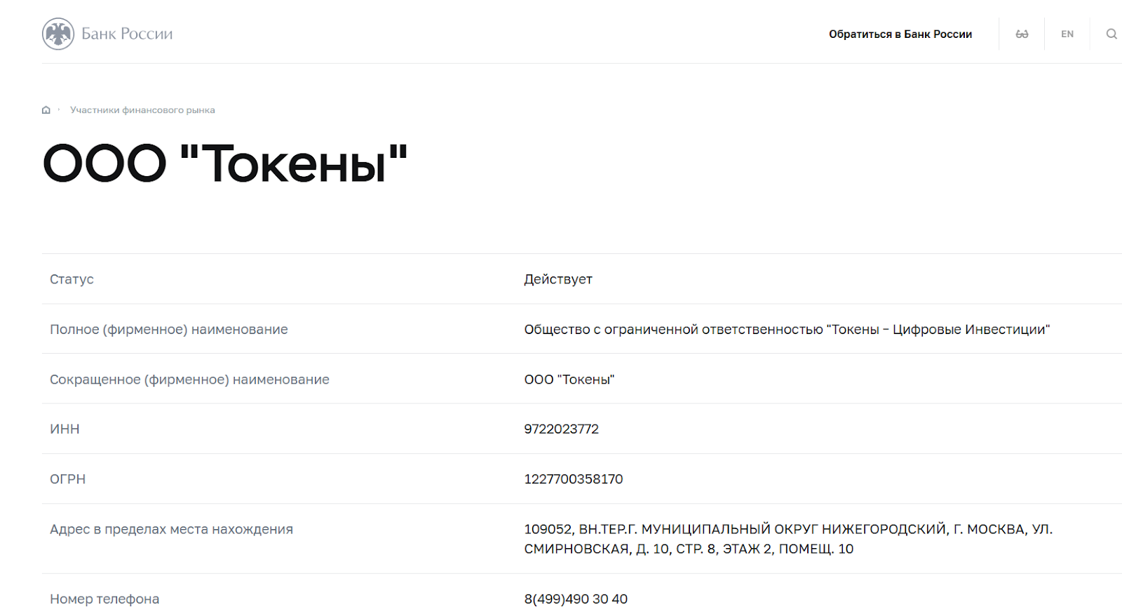 ООО “Токены — Цифровые Инвестиции” официально включена в реестр Банка России как оператор информационной системы. Это право компания получила 15 июня 2023 г. и она дает ей возможность легально выпускать ЦФА, вести учет прав, проводить операции и работать как полноценная инфраструктурная площадка.
