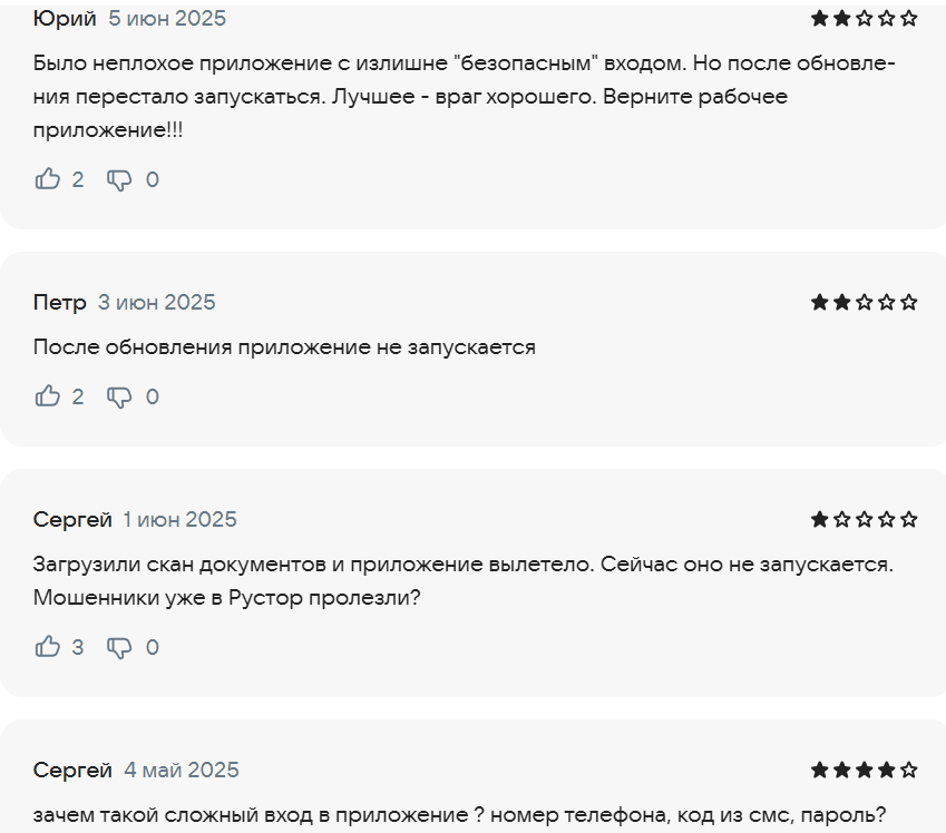 Операционная часть тоже заставляет задуматься: приложение в RuStore имеет средний балл 2.3 из 5, и почти все оценки низкие. Люди пишут, что приложение зависает, не пускает в личный кабинет, не проходит авторизацию, выдает ошибки и “сыпется” при загрузке документов.