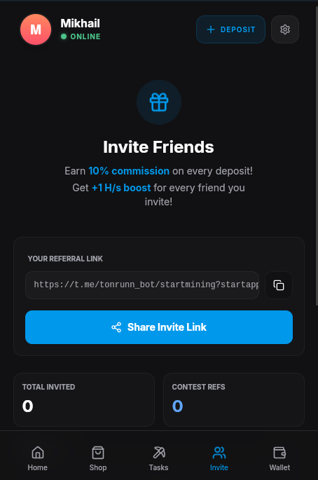 Ton Run Miner — якобы инновационная платформа для облачного майнинга прямо в смартфоне через мессенджер Телеграмм. Разработчики обещают пользователям пассивный доход в токенах TON за счет покупки виртуальных мощностей. Они говорят, что нам нужно просто запустить приложение, завести депозит и наблюдать за растущим балансом. Звучит многообещающе, но давайте разберем механику проекта детальнее.