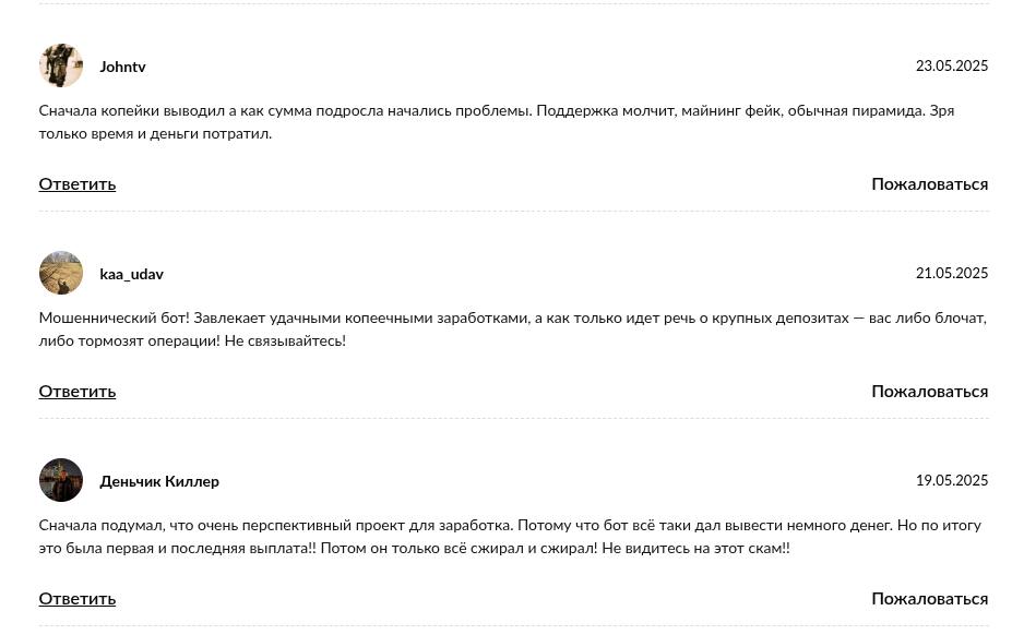 Поделитесь опытом в комментариях к обзору, если вы уже пытались запросить выплату из бота «Тон Ран Майнер». Ваш отзыв о заморозке баланса и общении с саппортом поможет другим участникам рынка сберечь свой капитал.