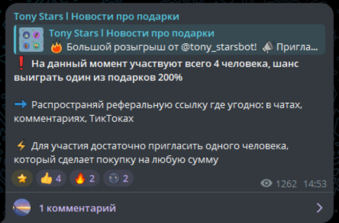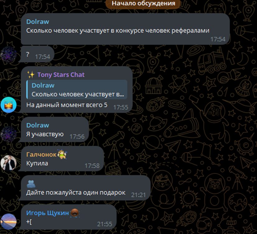 Условия конкурсов простые – надо пригласить наибольшее количество друзей, которые сделают минимум одну покупку в боте, самостоятельно приобрести звезды через TonyStars или оформить Премиум.