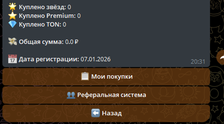 В личном профиле Tony StarsBot есть разделы со всеми совершенными покупками и ссылкой для реферальной программы. Отдельно указывается дата регистрации, общий баланс в рублях. Есть информация по количеству купленных звезд, TON, Премиум.