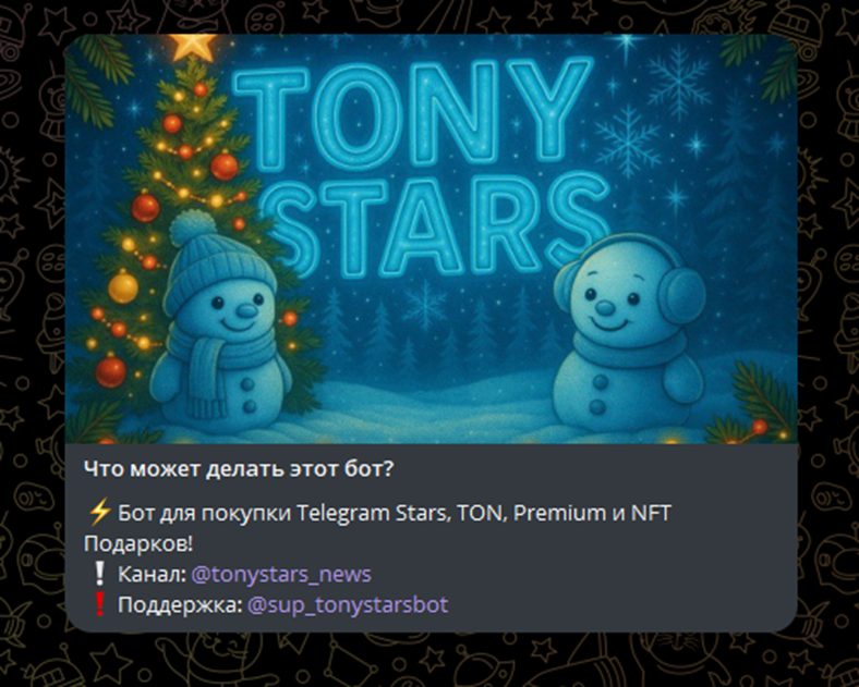 Tony Stars Bot – бот в Телеграмм по продаже звезд, подарков и аккаунтов Премиум. Пользователям предлагаются доступные цены, проведение разнообразных конкурсов, призами в которых являются коллекционные изображения.