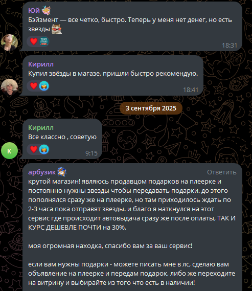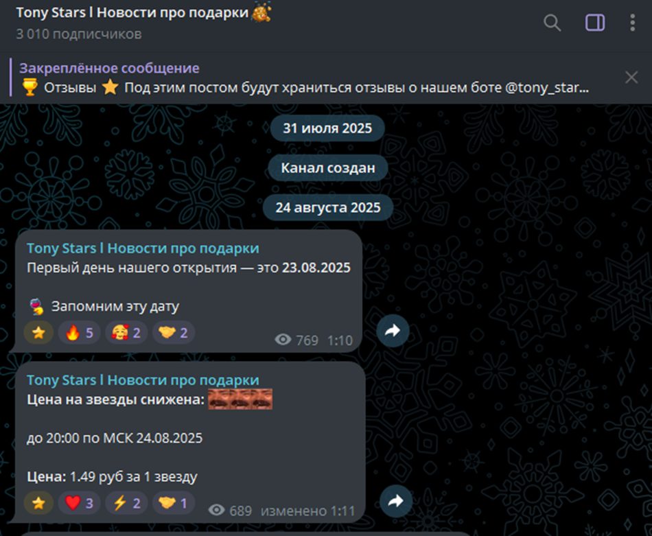 Проект начал работу 31 июля 2025 года, хотя группа и бот были полноценно запущены только 23 августа. В первых же постах установлена стоимость покупки звезд ТГ – по 1,49 рубля за единицу. Это немногим ниже, чем на официальных источниках, где часто можно купить stars по 150-200 рублей за пакет из 100 штук.