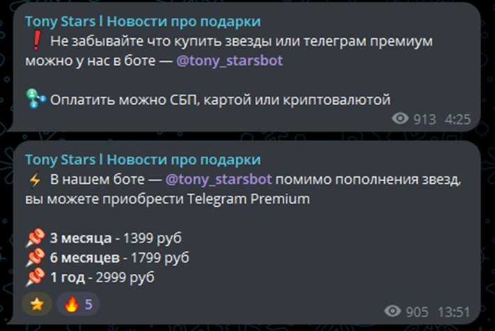 Также на канале предлагаются покупки коллекционных изображений, редких подарков, пополнение счета в TON. Через бот можно приобрести подписку Премиум ТГ: