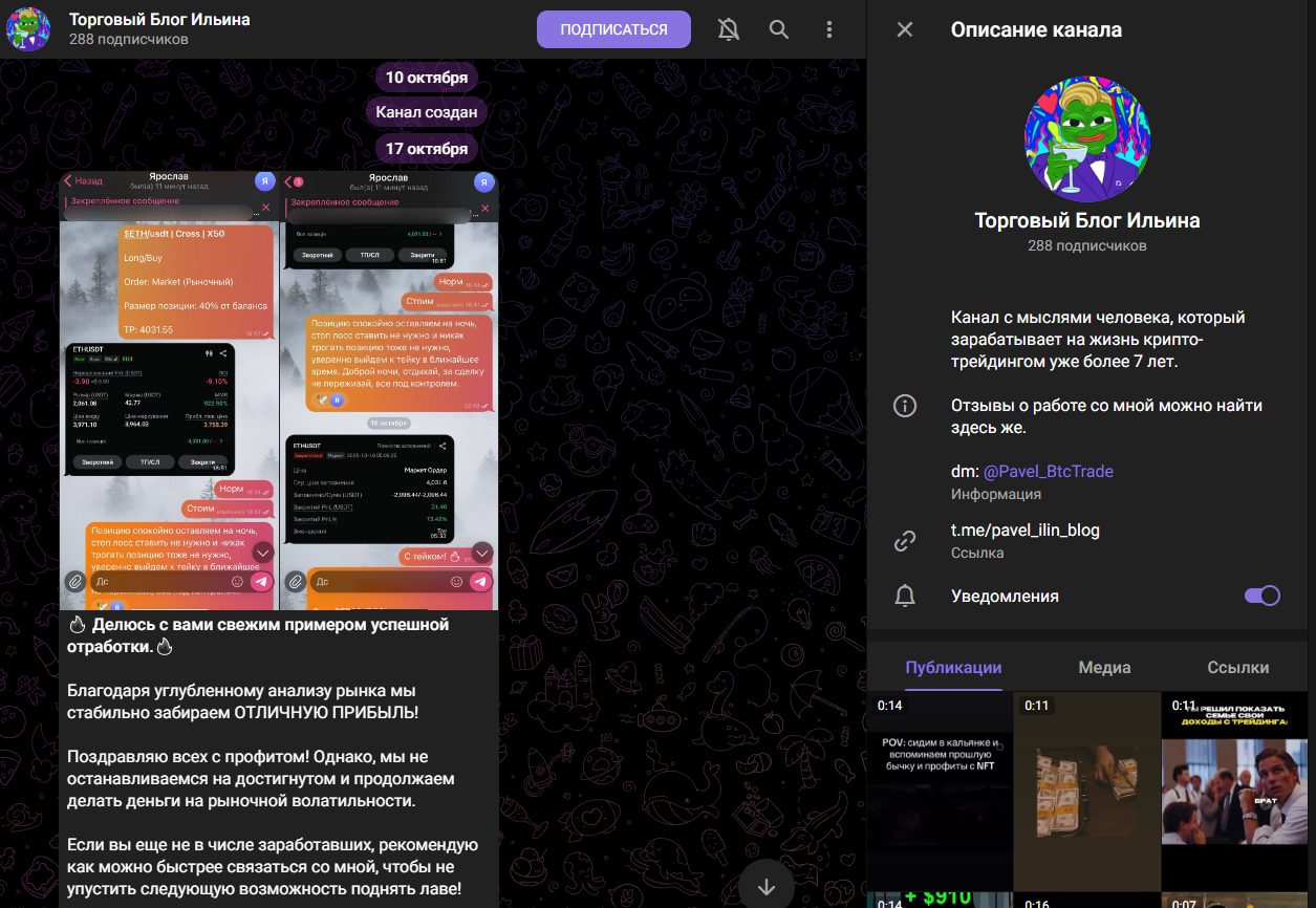 Трейдер Павел Ильин создал собственный публичный телеграмм-канал 10.10.2025. Спустя неделю админ опубликовал первый пост, но не приветственный, в котором бы трейдер предъявил лицензию или статистику успешных сделок. Пост посвящен примеру отработки сигнала в плюс, оформлен в виде скринов переписки с неким Ярославом, которому в результате удалось заработать деньги на сделке. Идентичные посты составляют 90% всего контента.