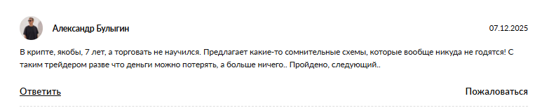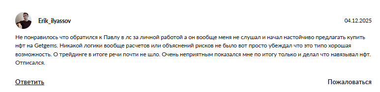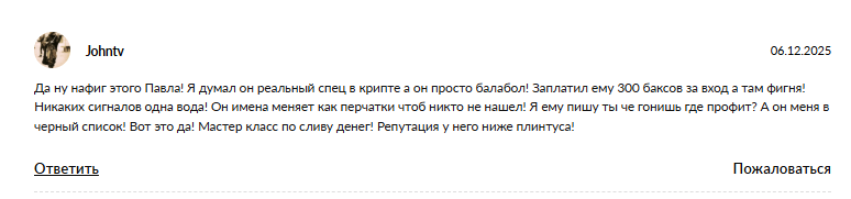 Положительных отзывов о сотрудничестве с трейдером в интернете на декабрь 2025 года нет. Недовольные клиенты убеждают, что на сигналах Павла можно только потерять деньги.