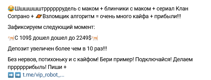 Также он ведет группу в ВК, которая называется «Торговый Жеребец». Именно здесь Дима продвигает своего бота, в Телеграмм он лишь показывает результаты работы софта.