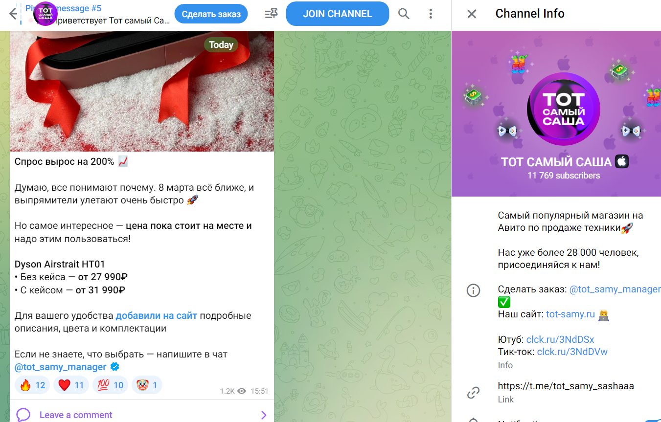Тг-канал Tot Samy Sashaaa ведется с 2020 года, и сейчас здесь более 11k фолловеров. Просматривает посты половина аудитории, и это хороший показатель заинтересованности.