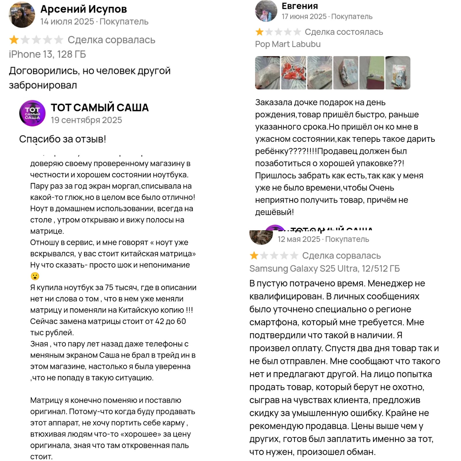 Во время разоблачения магазина Тот Самый Саша мы нашли на Авито отзывы о том, что работа сотрудников некачественная, так как заказы отменяют без причин, и при бронировании товар может купить другой человек.