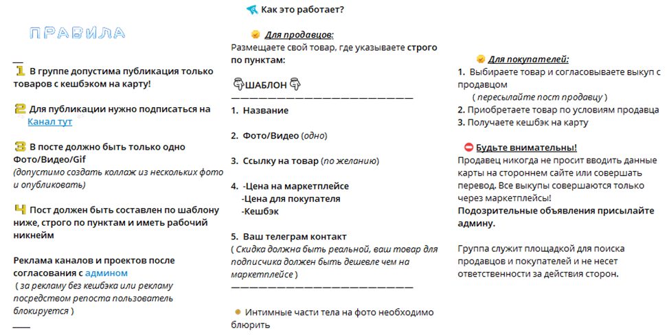 Продавцы, которые хотят прорекламировать свой магазин или товар, должны указывать в посте: название позиции, ее фото, ссылку на товар и свой контакт в Telegram. Стоимость указывается в двух видах: оригинальная и для покупателя с учетом процента кешбэка. Другие пользователи могут просматривать карточки на канале с ником Tovarsozona и выбирать то, что их интересует. Покупка согласуется в переписке с продавцом. Владельцы группы «Товары за отзыв» не несут ответственность за действия обеих сторон.