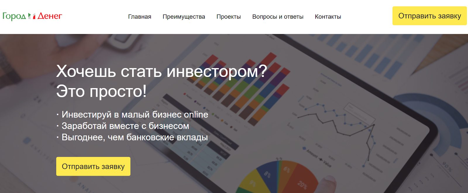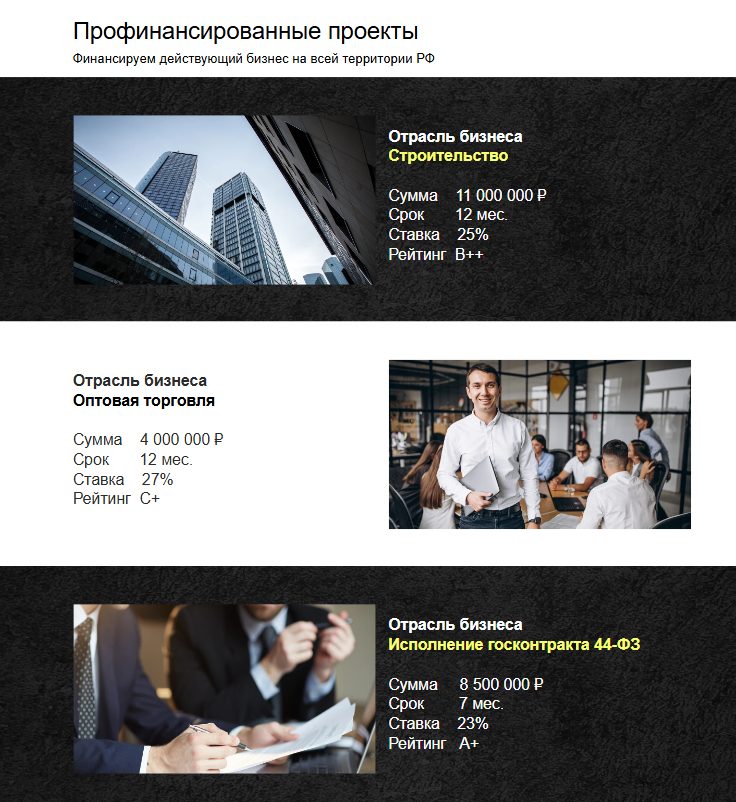 «Город денег» – краудфандинговая платформа. Привлекает инвесторов для кредитования бизнеса. Заемщикам обещает выгодные условия займов, а вкладчикам – высокий доход. Подробнее расскажем далее.